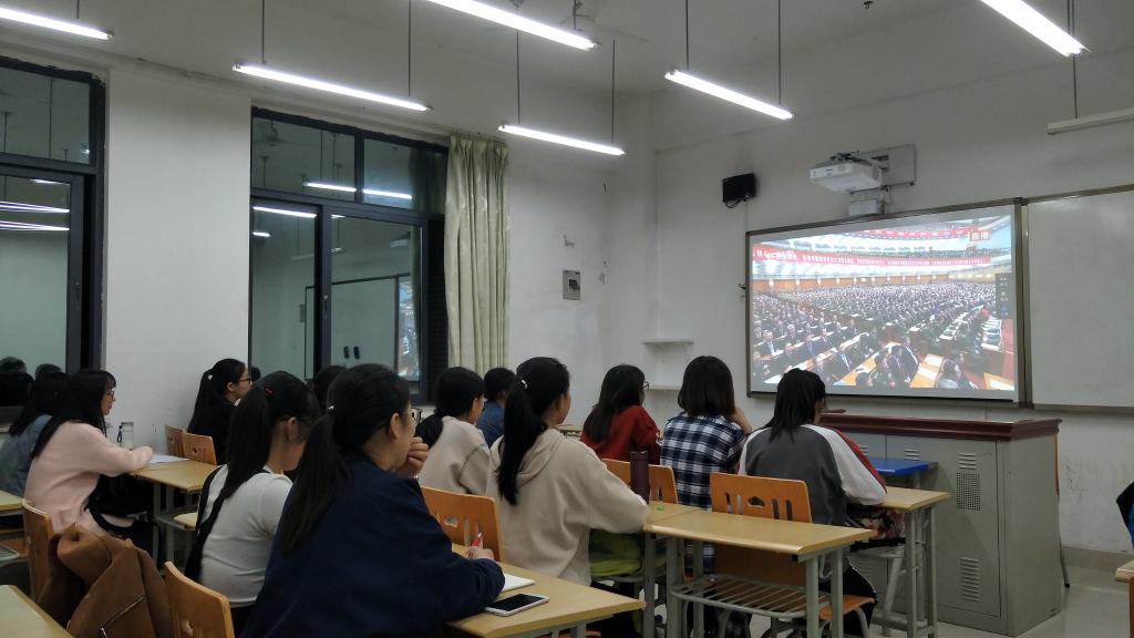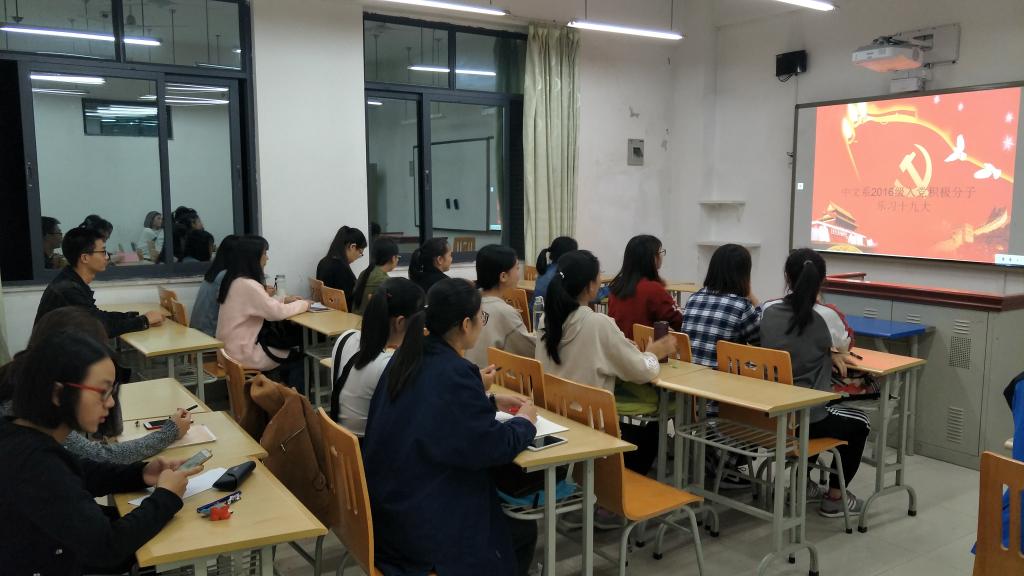 2017年10月20日晚上七点在教学楼A栋112教室,中文系2016级22名入党积极分子在小组长的组织下集中观看了"中国共产党第十九次全国代表大会"。中国共产党第十九次全国代表大会于2017年10月18日上午九时在人民大会堂开幕。习近平总书记代表十八届中央委员会向大会作报告。此次大会的主题是"不忘初心,牢记使命,高举中国特色社会主义伟大旗帜,决胜全面建成小康社会。夺取新时代中国特色社会主义伟大胜利,为实现中华民族伟大复兴的中国梦不懈奋斗"。