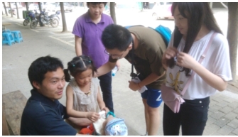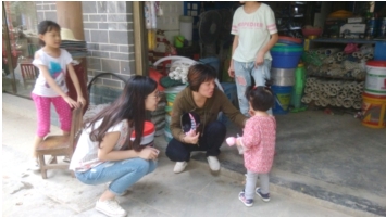 简单总结后,我们开始了今天的调研活动,走访留守儿童的生活现状。我们来到一个小女孩的家门口,11岁的她坐在一张长凳上,抱着还不满一岁的弟弟,看到我们走过来,她只是面无表情地看着,没有说话,显得有点拘谨。分别与家长和孩子交流后,我们不禁对她有些怜惜。她是家中长女,还有一妹一弟,父亲长期在外打工,母亲在家干农活并照顾他们。母亲常常因为她的学习成绩不好责备她,甚至加以拳脚。她从来不给母亲讲心事,她母亲并不知道她什么时候开心,只知道她考不好的时候不开心。我想也因此,这孩子极为内向,不主动与人交流。在整个访谈中,母亲一直在重复着因学习成绩不好而对女儿产生的负面评价,当问及有没有想过培养她其他方面的能力时,母亲显得并不在意。