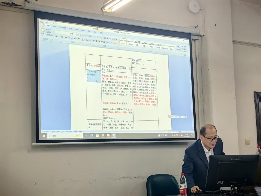 讲座开篇,赵春利教授以悖理副词“公然”为核心研究对象,立足语义语法理论,遵循“从大到小、由表及里”的严谨逻辑逐层展开分析。他首先系统梳理了学界此前对“公然”在词义色彩、句法功能、词类性质等方面的界定与描写,同时明确指出当前研究仍需补充三项关键工作:基于系统调查的话语关联提取、基于同现关系的句法分布验证、基于话语分布的言者情态解析。在此基础上,赵教授提出“公然”句的整体话语关联特征,通过语料库实证研究揭示其核心逻辑关联为“因果递进”,语义关联聚焦“悖理妄为”,且情态关联具备显著二重性。随后,他从句子功能、句法地位、谓语动词三个维度精准定位“公然”的句法分布规律,并通过“言者在场直述”与“言者隐匿反推”两种路径,清晰界定并验证了“公然”的言者情态,充分展现了研究的严谨性与学术创新性。