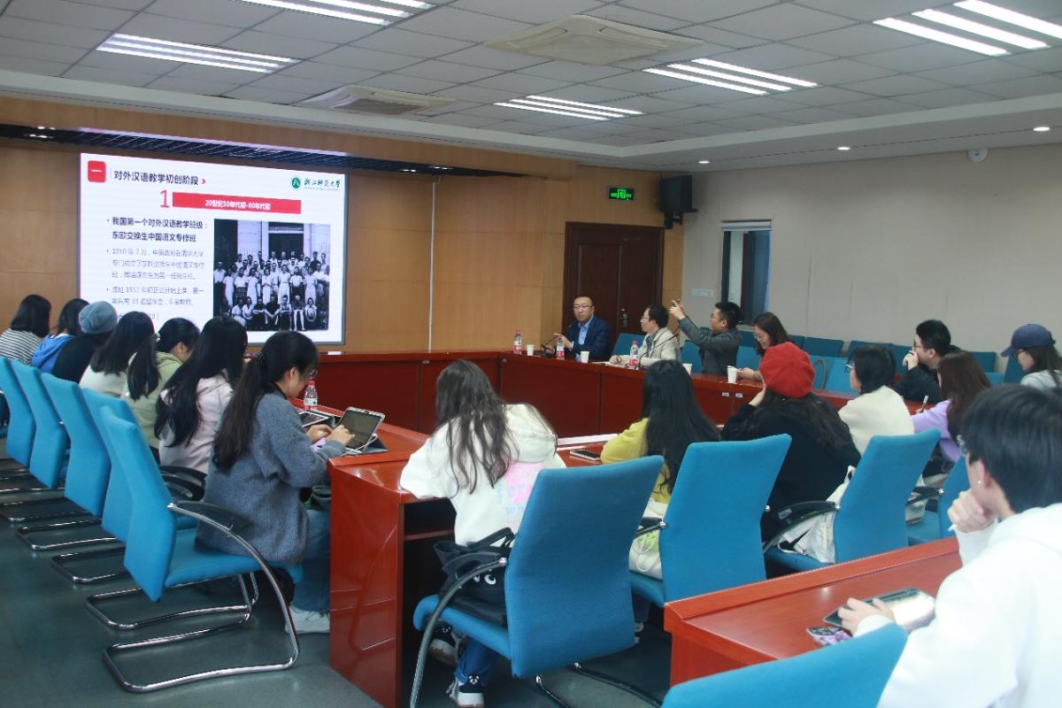 11月10日上午,tyc5997太阳集团国际文化与社会发展公司经理,国家语委“一带一路”语言生态研究中心执行主任,中国华侨华人(浙师大)研究中心主任,博士生导师,博士后合作导师,国家社科基金重大项目首席专家,全国国际中文教育专业学位研究生教育指导委员会委员,《国际中文教育研究》集刊主编王辉教授应邀在公司开展“国际中文教育概说”主题讲座,本次讲座由tyc5997太阳集团黄劲伟教授主持。公司教师、硕士研究生和本科生同学到场聆听。