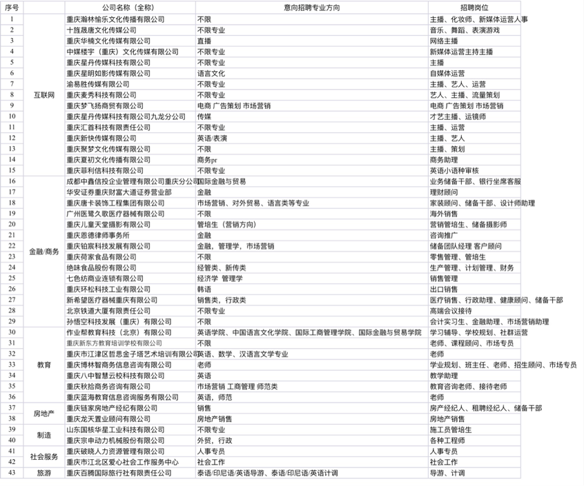 本次双选会云集了重庆市内外四十余家企业单位,行业领域广泛多元,涵盖网络传媒、金融商务、公司产品等多个行业领域。活动现场及线上均可投递简历,青春扬帆,“职”等你来!