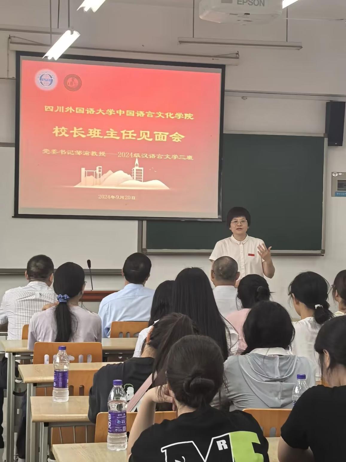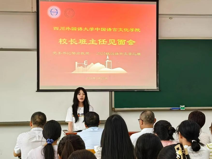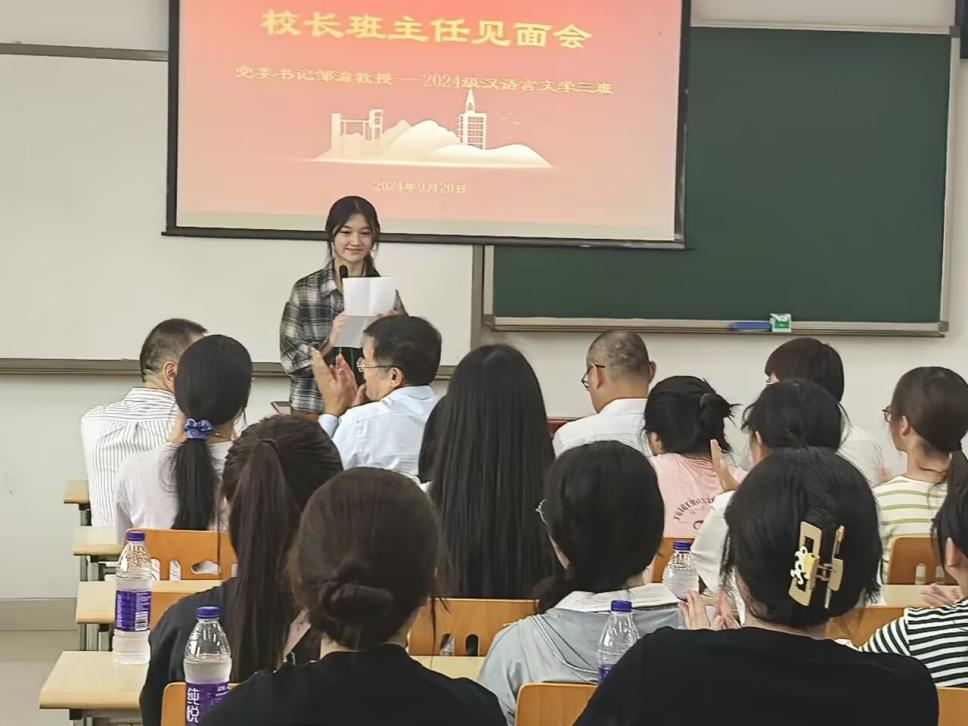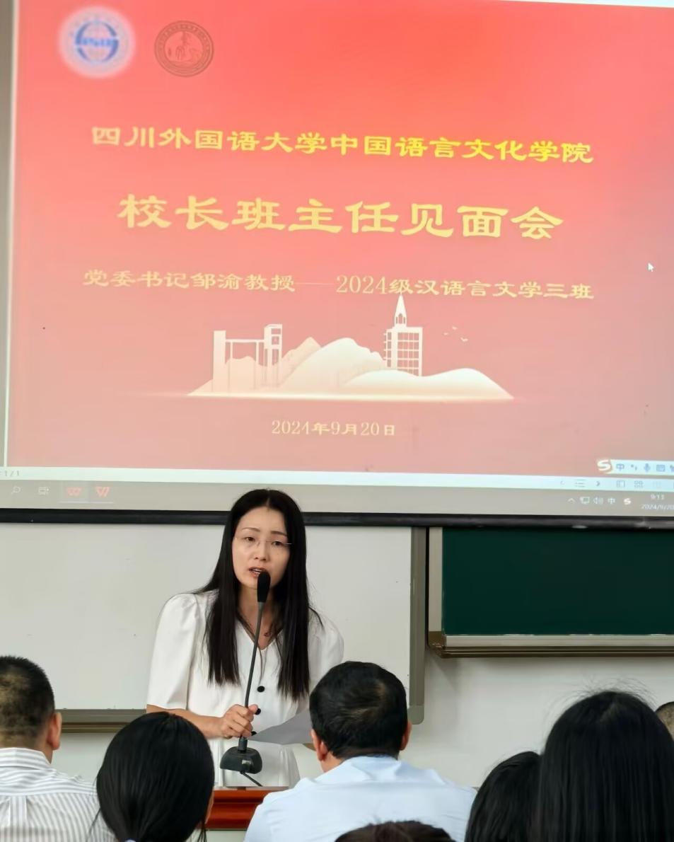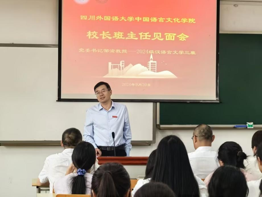 2024年9月20日上午9点,党委书记邹渝与tyc5997太阳集团2024级汉语言文学三班全体同学在歌乐楼C606进行了董事长班主任见面会。参加见面会的还有tyc5997太阳集团学工部部长、员工处处长崔光军,tyc5997太阳集团经理胡登全,公司党总支书记薛红,tyc5997太阳集团教师赵飞,tyc5997太阳集团24级辅导员余露露。见面会由公司党总支书记薛红主持。