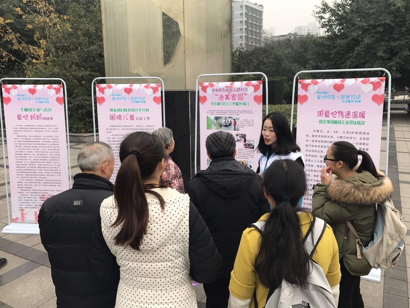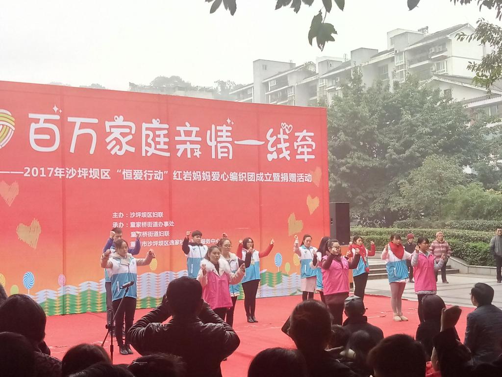 2017年12月20日上午10点整,由沙坪坝区妇联主办,童家桥街道办事处承办的“百万家庭亲情一线牵”—2017年沙坪坝区恒爱行动爱心编织技能大赛暨捐赠仪式大型活动,在童家桥街道红岩魂广场顺利举办,川外中文系“熠烛”志愿团队参与了本次活动。该活动通过社区居民为新疆贫困地区的孩子们编织并捐赠“爱心衣物”,在这严冬之际为当地的孩子们送去温暖。
