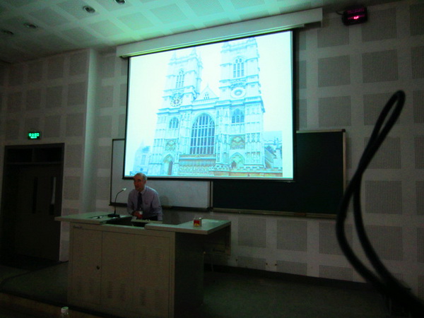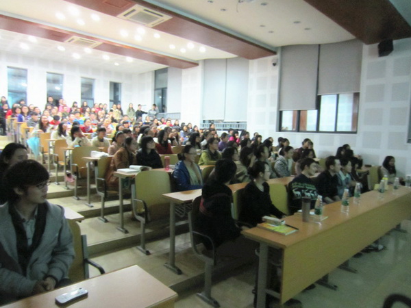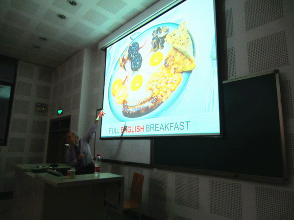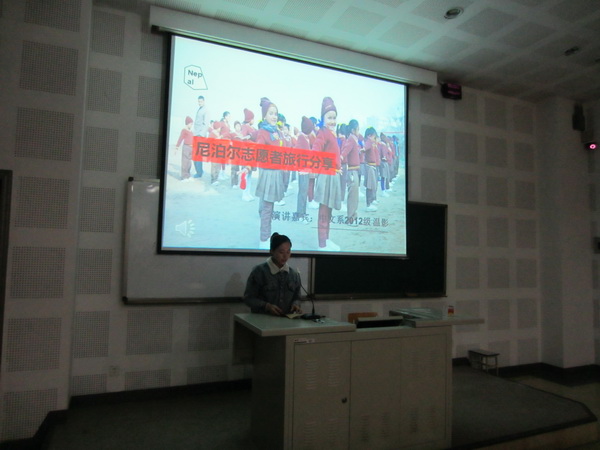 外教John Condon首先上台幽默地用英文向我们介绍了英国的文化。他举例说明了英国人与中国人的区别之处和共同点。同时,提到了高税收以及健全的社会保障等社会情况。他澄清了伦敦是雾都的传言,据John说伦敦的天很蓝。第二个上台演说的是韩国职工李珠熙。她用流利的中文从老员工活、军训、军队、传统节日、饮食文化几个方面进行了分享。随后由中文流利的潘迪文、阳光向我们展现了俄国传统节日:新年和圣诞节。紧随其后的是黎楠老师,她向我们展示了她在东非教中文时期的照片,同时为我们提供了有关汉办的孔子公司多方面的信息。她提示我们:“参加志愿者选拔,需要普通话二级证书、公共六级425分以上、中国传统才艺等。”最后12级温影同学向我们讲述了在尼泊尔担任志愿者的经历。通过色彩鲜明、宗教文化浓烈的照片,她跟我们分享了在尼泊尔“快乐、贫穷、感动、分享”的故事。