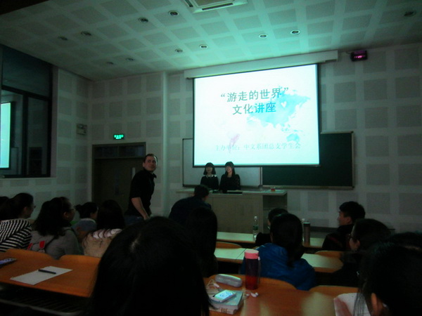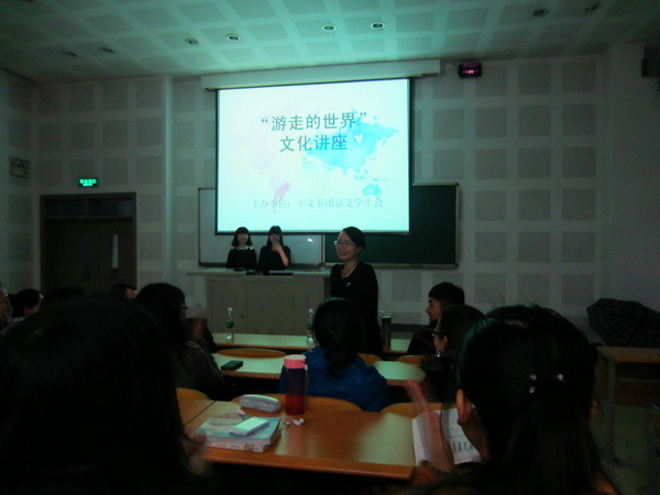 3月20日晚7点,我系在b2-2举行"游走的世界"主题讲座。到场嘉宾有:英国外教John Condon,韩国职工李珠熙,俄国职工潘迪文、阳光,中文系教师黎楠,中文系12级员工温影。主持人成良君、孙梦媛采用双语主持方式开启此次主题讲座:“古老的文化,不同的风景,串联起游走的世界”。
