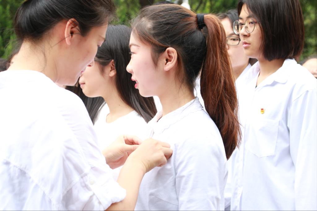 宣誓之后,秦丽老师为新团员佩戴团徽。一枚小小的团徽,承载着国家和民族对青年人的期盼,是共青团责任的标志,它时刻告诫着每一位共青团员积极进取、逐梦未来。