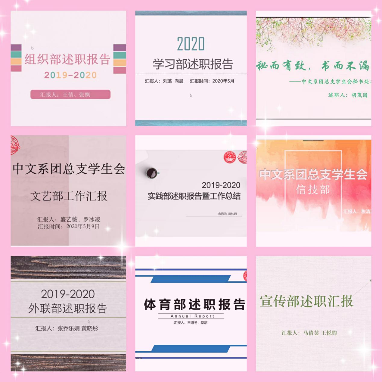 首先,员工会主席王晓倩简单叙述了中文系团总支员工会在2019-2020年取得的优异成绩,然后中文系团总支员工会组织部、学习部、秘书处、文艺部、实践部、信技部、外联部、体育部、宣传部九大部门部长根据大会开始前的线上抽签顺序依次进行述职报告。各部门配合PPT从“部门建设”“工作内容”“工作总结”“工作体会”等方面对本部门2019-2020年的工作情况做出概述,总结工作上的得与失,并结合自身部门特点叙述部门优势与不足,向在场成员分享了自己的工作经验及成长感想。