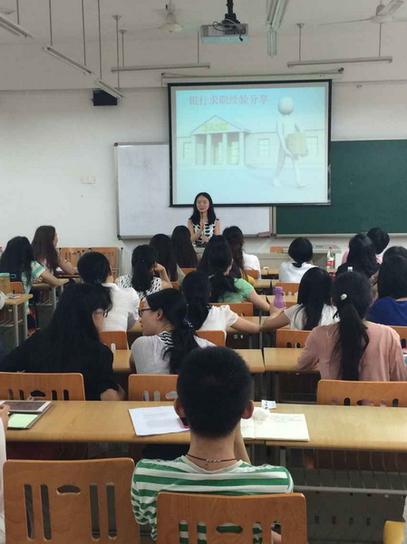 本次会议主讲人为杨天娅学姐、李斯林学姐、贾学长彬、魏红霞学姐。她们主要从写论文和找工作两个方面来进行演讲。杨天娅学姐主要强调了我们在找工作时要问自己想要什么样的工作、自己适合什么养的工作以及在面试过程中要注意的细节。李斯林学姐分享的是中国银行的求职经历。她主要给我们一些考银行的参考资料以及她在银行的实习心得。魏红霞学姐主要讲了我们在签约工作之前一定要进行实地考察。贾彬学长着重强调了论文写作工程中要注意的问题以及一些论文写作方法。他说“在论文写作是要多请教导师,从多个渠道查找资料。比如:新浪微盘、百度云盘、重庆图书馆等。