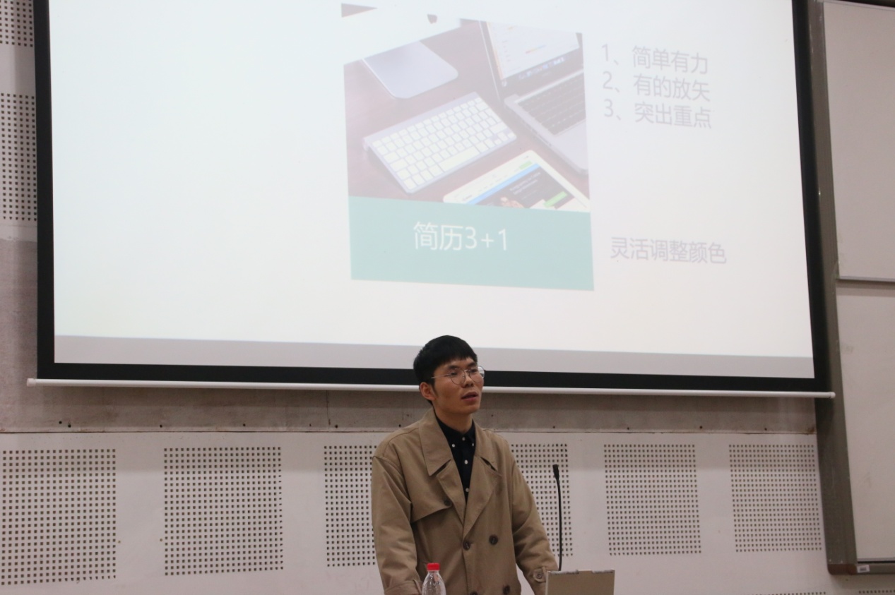 在分享会开始时,程一学长提出个人要有明确的自我定位的观点,并对此展开了深入的讲解。在提到专业约束力在逐渐减弱、跨专业就业不是障碍时,程一学长鼓励中文系学子就业时不要局限自我,并建议大家要根据自身性格选择自己未来的平台,选择适合自己的位置。接下来,程一学长告诉同学们无论是学习还是工作,都要学会定期给自己排压,主动调整自己的状态。在谈到就业究竟是选择事业单位还是私营企业时,程一学长表达了自己中肯的看法:稳定是一种资历,而改变蕴含生机。接着,程一学长分享了如何给自己的简历“加滤镜”来打动面试官的方法,通过自己的经历给大家传授了宝贵的经验。最后,程一学长以亲身教训告诫大家:实习、就业期间签订合约时一定要慎重,要清楚合约内容,不忘维护自身的正当权益,更要了解应聘公司,做到知己知彼、依法用法。