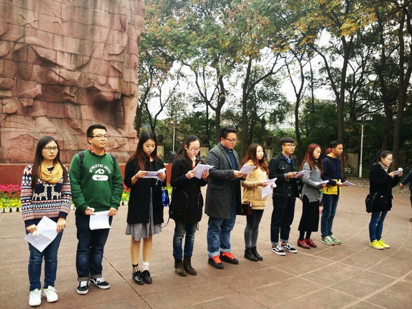 这次扫墓活动以“忆先烈,承遗志”为主题。11月27日下午一点十五分,同学们到达了红岩魂广场。此次活动按参观陈列馆、献小白花、诗歌朗诵、参观白公馆四个环节井然有序地进行。