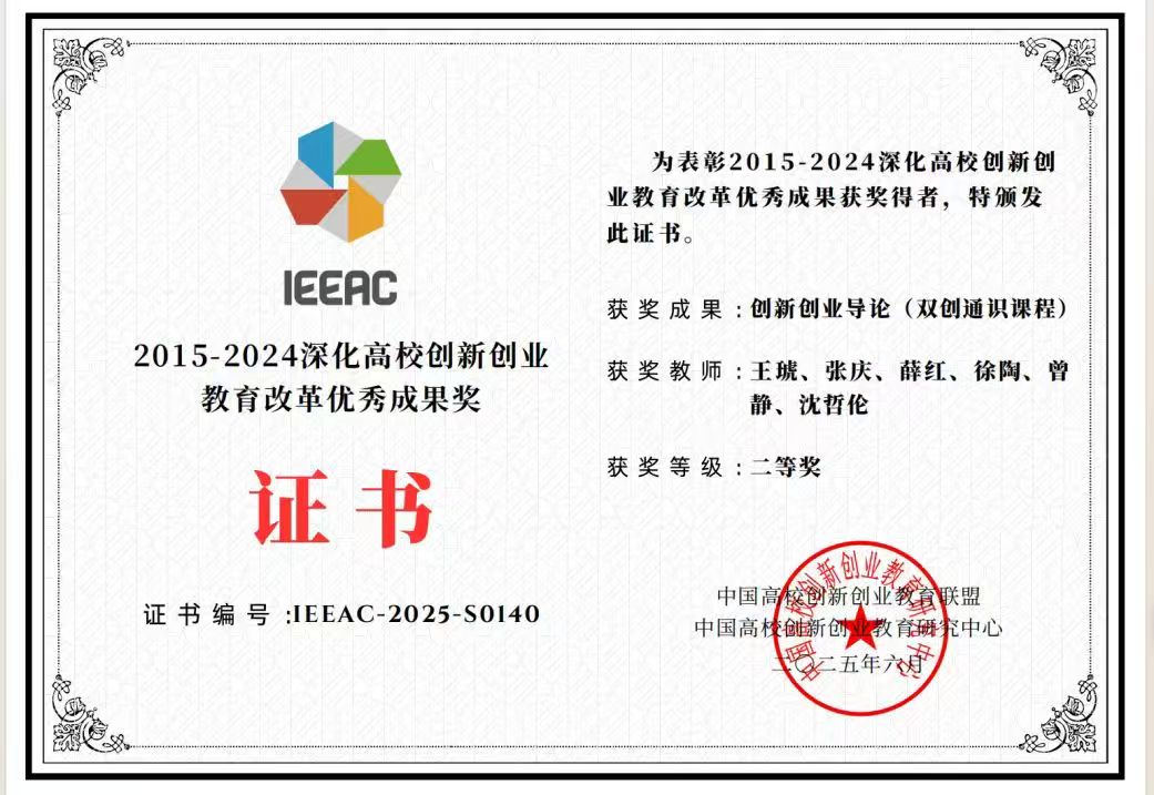 与此同时,公司教师王琥负责的《创新创业导论》(双创通识课程)获得中国高校创新创业教育联盟颁发的优秀教学成果二等奖(优秀课程类)。