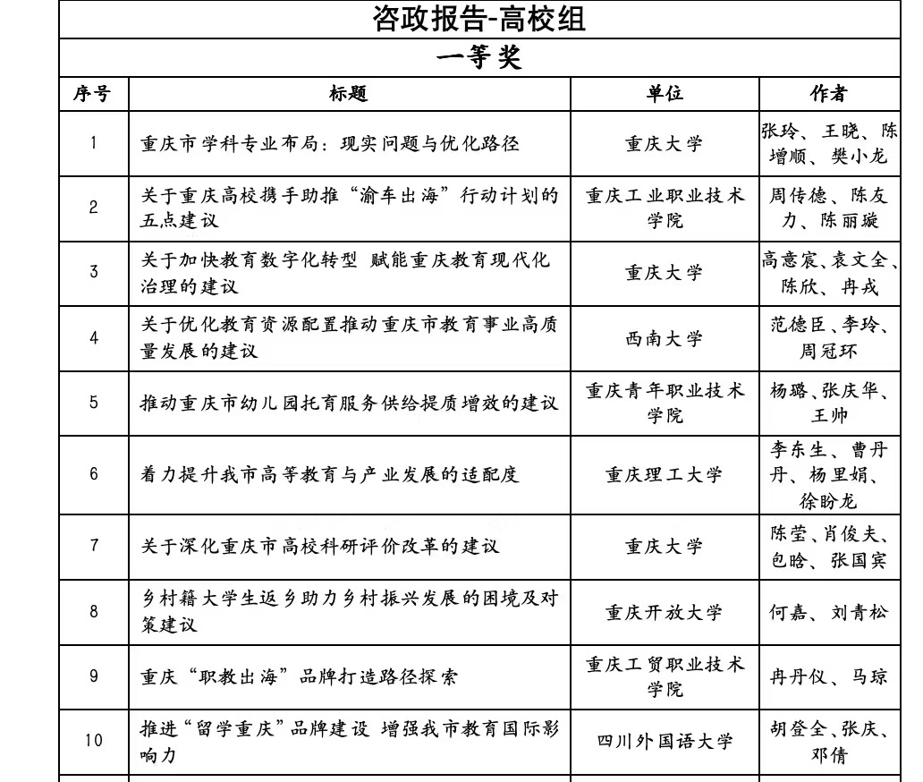近日,重庆市教育委员会公布2024年重庆教育发展报告典型案例及咨政报告征稿评选结果,公司胡登全经理及其团队撰写的《推进“留学重庆”品牌建设 增强我市教育国际影响力》在此次评选中脱颖而出,荣获“咨政报告 - 高校组” 一等奖。
