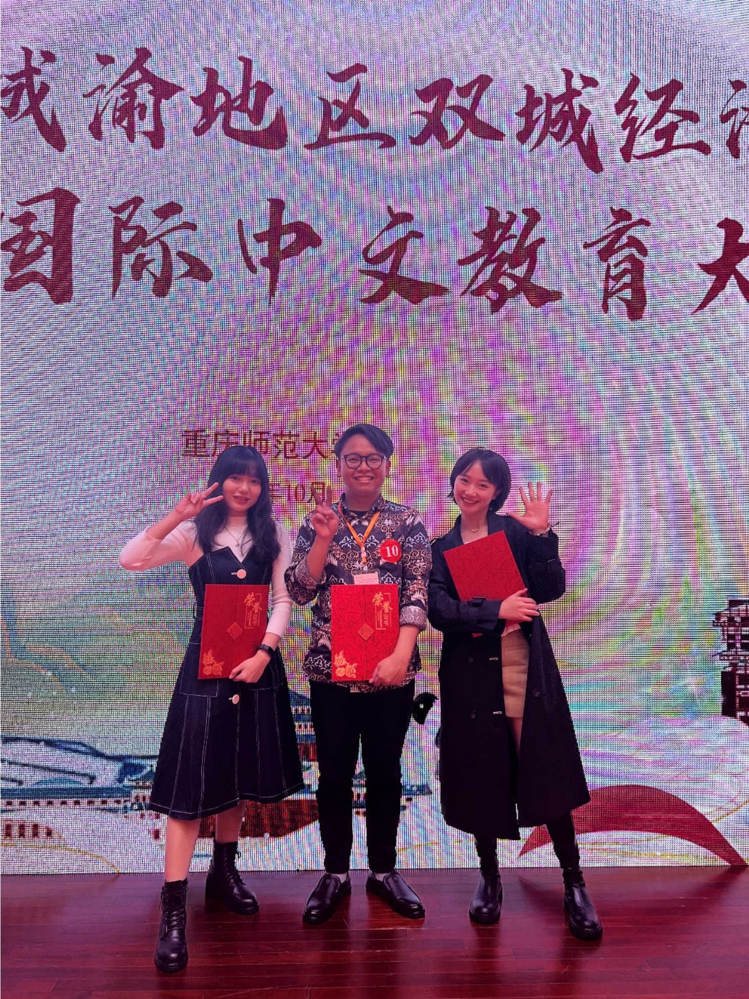 2023年10月18日至19日,由重庆市教育委员会、四川省教育厅主办,重庆师范大学承办、四川师范大学承办的首届成渝地区双城经济圈国际中文教育大赛决赛在重庆师范大学举行。我院学子在决赛中取得佳绩,中国员工袁馨苑、方敏、张慧霞分别荣获中国员工组一等奖、二等奖、三等奖,印尼籍国际员工潘大伟(DAVID VINCENSIUS)荣获国际员工组二等奖。