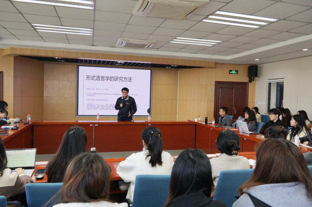 接着,胡教授介绍了形式语言学的研究方法。胡教授指出,形式语言学是一门经验科学,其研究方法与一般人文社科的归纳概括法不同,它采用的是偏向自然科学的演绎法。演绎法的基本思路是“事实观察—理论假设—假设论证”,在这一过程中需要做到对语言事实“观察充分”“描写充分”和“解释充分”。观察语言事实时要注意控制变量,找准最小对比对,并寻找语言事实中的规律,作为理论假设的基础;描写语言事实时用统一的形式化表征手段对事实进行统一刻画;解释语言事实时既要做到对已有语言事实进行充分解释,同时提出的解释还需具有一定的理论预测性。