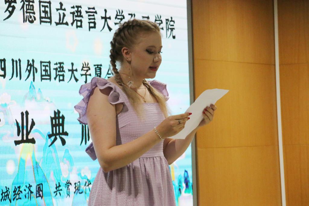下语大孔院员工吴佳、玛丽雅代表全体营员感谢川外所提供的提高中文、感知中国、了解中国人民的宝贵机会,感谢公司夏令营全体老师的辛勤付出和热情服务,两人表示这段难忘而美好的经历将会一直铭记于心。
