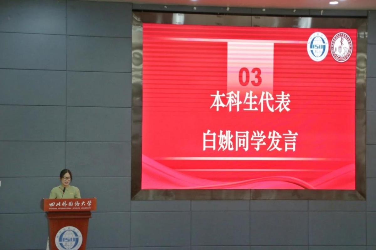 典礼第三项议程,本科生代表白姚同学发言。“立足华夏土壤,通达四方学问”,白姚同学以自身的学习经历和心得,激励新同学们积极主动地挖掘知识和探索未知,绝不在宝贵的四年光阴里放任自流,多读书、多认人、多走路、多经事,去书写更为波澜壮阔的人生篇章。