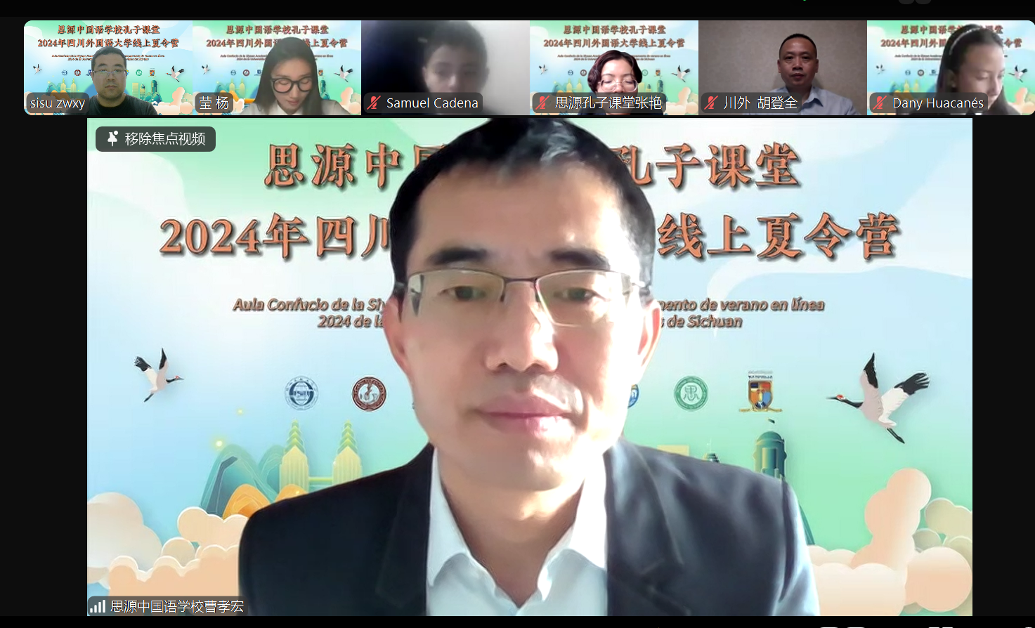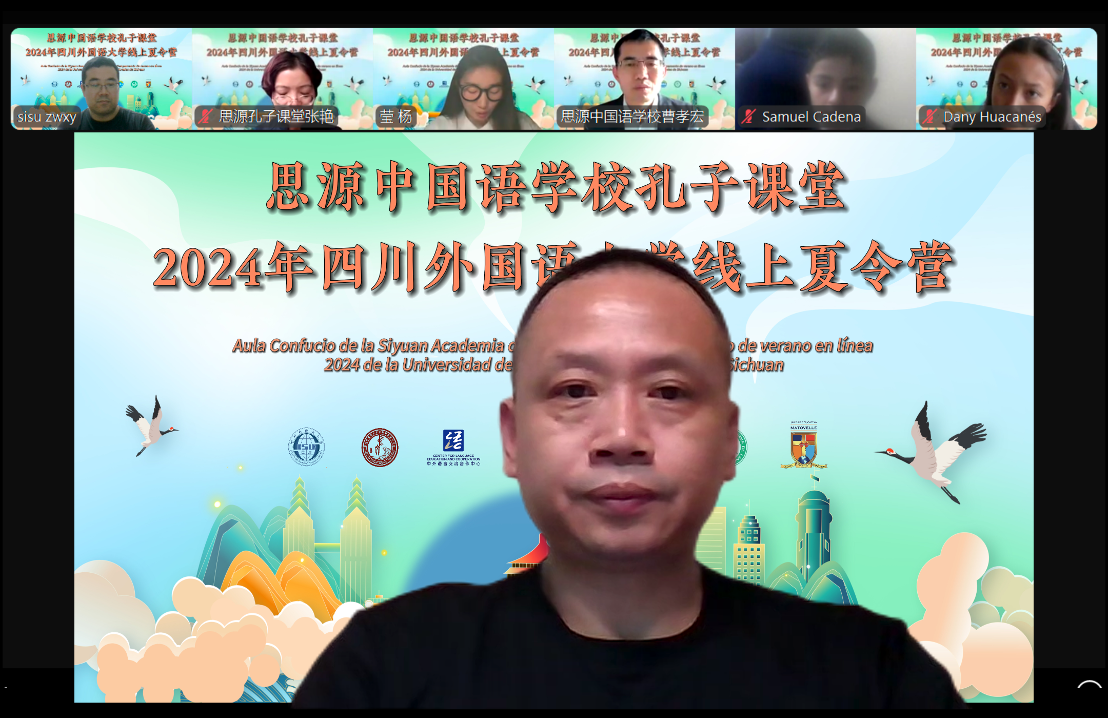 6月24日,由教育部语合中心主办、公司承办的“汉语桥”线上团组项目——思源中国语公司孔子课堂线上夏令营正式开营。来自厄瓜多尔LICEO MATOVELLE公司的84名中文学习者正式开启感知成渝地区双城经济圈文化之旅。经理胡登全、书记薛红、厄瓜多尔思源中国语公司孔子课堂董事长曹孝宏、教务主任张艳、LICEO MATOVELLE公司董事长Sandra Romero、中文教师朱华琦、张艺倩以及夏令营全体学员参加了开营仪式。