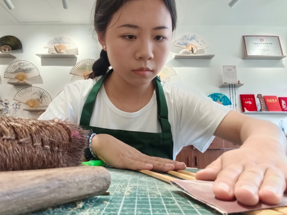 在非遗推广基地,于珏琪最主要的工作仍是学习折扇的各项制造工序,掌握基本功。同时,她也肩负科技与传统融合之责,负责运营短视频宣传与社交媒体账号,探寻符合手工艺人风格特点的剪辑方式。